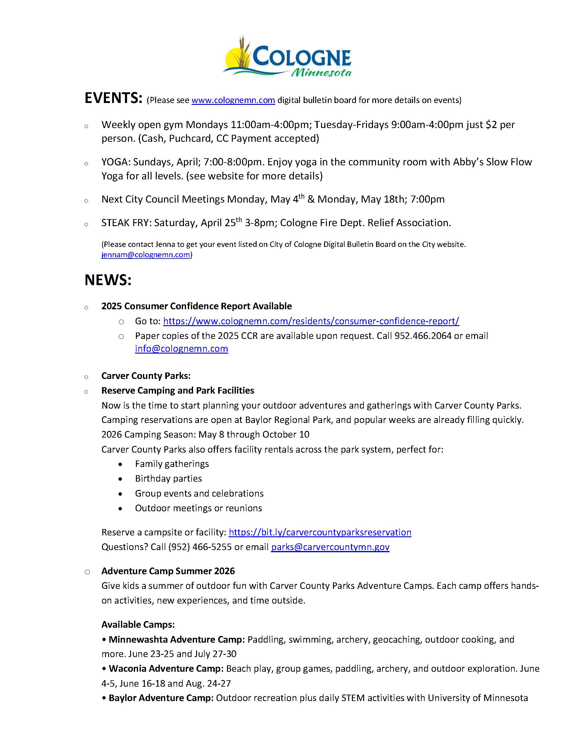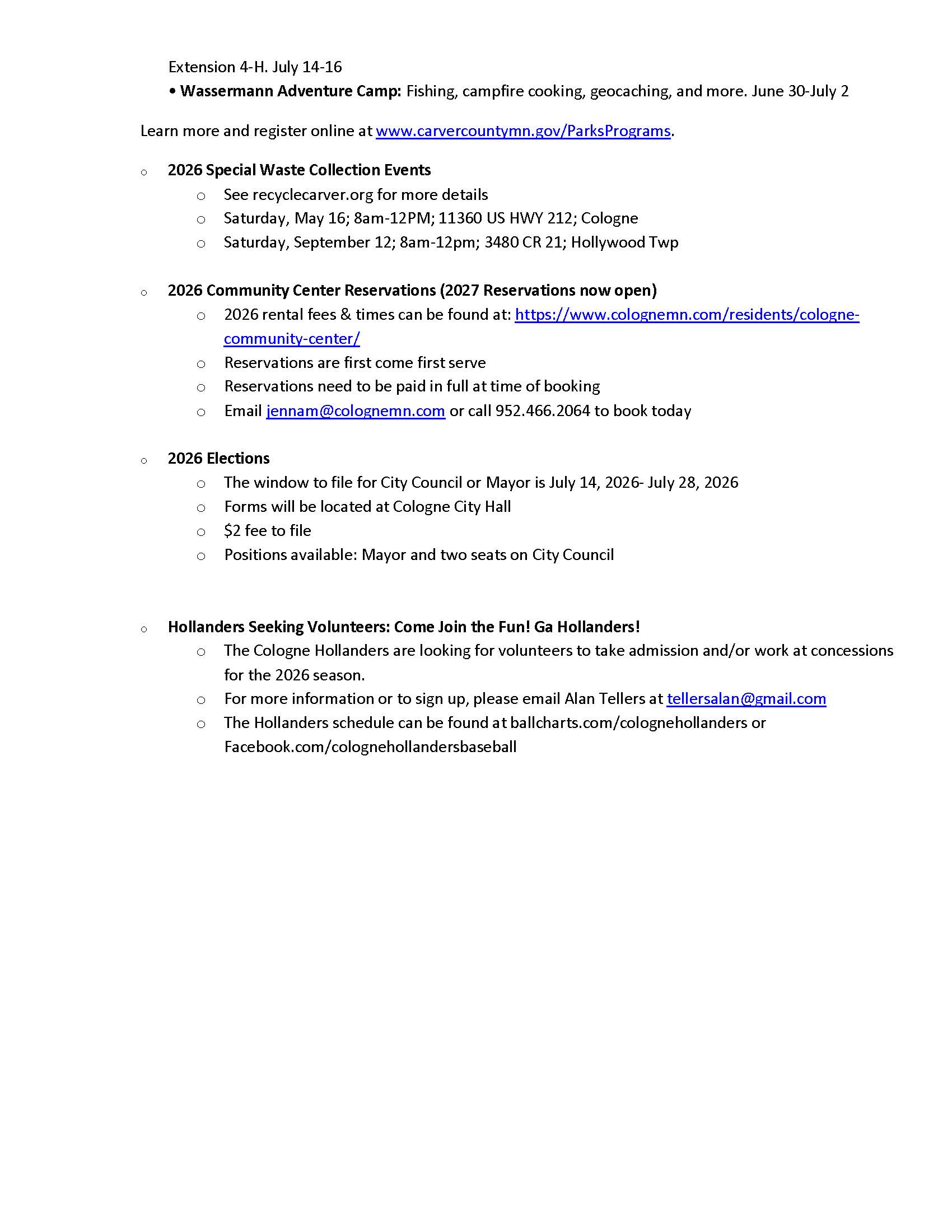 Please visit our Community Events page for updates on local fish fries, pancake breakfasts, and other events!